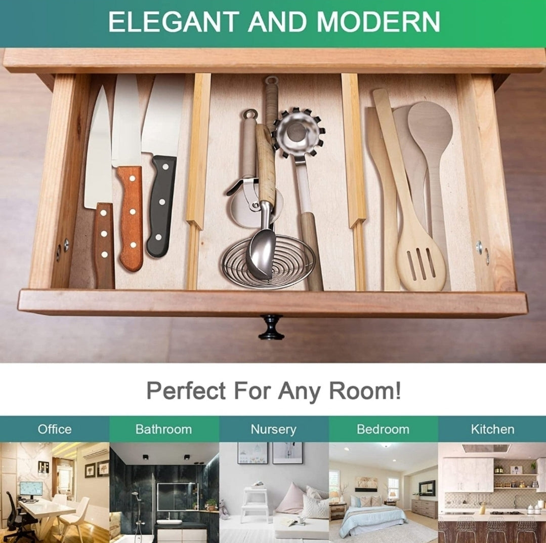 Each kitchen drawer divider has a built-in spring to keep them in place and just adjust the length of the divider to fit most drawers.Non-slip Rubber Pad End Design: The ends of these cutlery drawer organizers are backed with soft non-slip rubber to keep the kitchen drawer organizers sturdily in place and avoid scratching or damaging of your drawers.