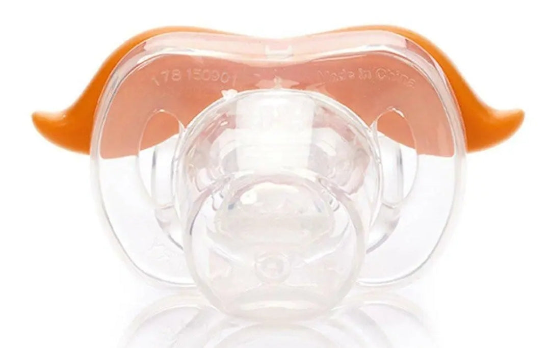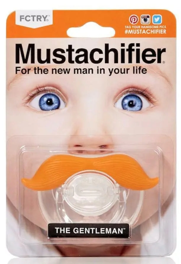 Introducing the Mustachifier Gentleman Mustache Pacifier Binkie! This fun and quirky pacifier is designed for infants aged 0-6 months, available in a vibrant yellow or orange color with an orthodontic nipple made of high-quality silicone material. It is a single-piece pacifier with a funny mustache design manufactured by FCTRY in China.